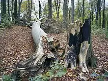 Studies show the possibility of a Trichoderma species being used as a biocontrol agent against the fungal pathogen.[13][14] Otherwise, there is no designated treatment for Kretzschmaria deusta once it has infected its host. Once established, the infection is terminal for the tree. It can result in sudden breakage in otherwise apparently healthy trees, with visually healthy crowns.[15] This can result in hazardous trees in public settings near roadways, trails, or buildings. Therefore, the recommended treatment would be to fell trees in areas that may be hazardous and to avoid using the infected plant material as mulch.[16]