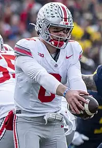 McCord competed with Devin Brown during spring practices and preseason training camp to succeed Stroud as Ohio State's starting quarterback in 2023.[14] He was named the starter for the Buckeyes' season opener, although head coach Ryan Day stated that the competition was still ongoing.[15] After completing 14 of 20 pass attempts for 258 yards and three touchdowns in a 35–7 victory in week 2 vs Youngstown State, McCord was named the starter for the rest of the 2023 season.[16][17] In Week 4 against Notre Dame, McCord led a game-winning drive in the final two minutes as Ohio State won, 17–14.[18] In Week 13 against the Michigan Wolverines, McCord threw for 271 yards and 2 touchdowns, but also threw a game-ending interception on Ohio State's final drive to Rod Moore as Ohio State lost, 30–24.[19]