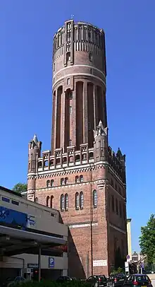 Lüneburg Water Tower (German: Wasserturm Lüneburg) is a water tower in the southeastern part of the Lüneburg old town in Lower Saxony, Germany, built by the architect Franz Krüger (1873–1936), from designs by Richard Kampf. Its erection was initiated on 3 October 1905, and the tower was taken into use in November 1907.[1] The water tower is 55 metres (180 ft) tall, and is the tallest building in the Lüneburg old town that is not a church. It stands between the considerably newer Nordlandhalle (which has been demolished meanwhile) and the Johanneum, the latter now used as a school. The tower consists of a square base of 18 metres (59 ft) and a round portion which is walled up around a 500 cubic metres (18,000 cu ft) large water tank. The upper part is carried by 16 solid columns.