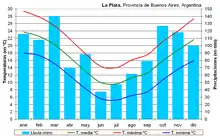 La Plata has a humid subtropical climate (Cfa under the Köppen climate classification).[14] During winter, temperatures are cool during the day and cold during the night, even reaching below freezing.[15] The average temperature in the coldest month, July, is 8.9 °C (48.0 °F). Winters tend to be cloudier than summer, averaging around 10 overcast days from June to August, compared to 6 overcast days from December to February.[15] Summers are warm to hot with a January high of 29 °C (84.2 °F) while nighttime temperatures are cooler, averaging 18 °C (64.4 °F). Spring and fall are transition seasons, featuring warm daytime temperatures and cool nighttime temperatures, highly variable with some days reaching above 32 °C (89.6 °F) and below 0 °C (32.0 °F).[15] The city is fairly humid, owing to its coastal location, having an average monthly humidity higher than 75%. La Plata receives 1,092 millimetres (43 in) of precipitation annually, with winters being the drier months and summer the wetter months. On average, La Plata receives 2,285 hours of sunshine a year, or 51% of possible sunshine, ranging from a low of 41% in June and July to 62% in February.[16] The highest temperature recorded was 41 °C (106 °F) on 14 January 2022 while the lowest temperature recorded was −5.7 °C (22 °F) on 14 June 1967.[17]
