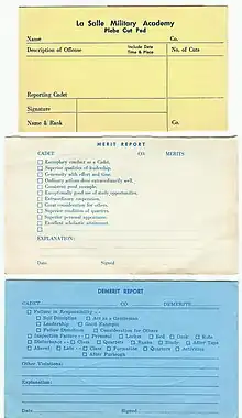 Cadets worked on a "Demerit System" in their daily activities in the JROTC program. Demerits were typically issued during personal and room inspections when deficiencies were found. Sometimes they were issued for failing to report for formations or lateness. Other times they were issued for insubordination, failing to follow orders or wisecracks. Accumulation of 20 or more demerits for lower classmen and 15 for upperclassmen on a given week resulted in "Post Duty" which was not standing guard as was required in the regular Military. For LSMA cadets, "Post Duty" meant marching with a rifle on Company Street beginning on a Friday Afternoon and for some, extending to Saturday morning when most of the other cadets had either gone home for a special weekend furlough, or began the day of "free time". Other times in lieu of marching Post Duty, cadets were required to do "Hunyak Duty." (The term "Hunyak" was cadet slang for the groundskeepers.) This meant the offending cadet was made to do work maintaining the Academy grounds such as raking leaves, cleaning up litter, emptying trash bins, etc. Fortunately, an excess of demerits could be offset by the accumulation of "Merits," which were usually awarded for excellence in drill or inspections, or for doing favors for upperclassmen and sometimes Faculty members.