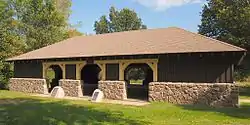 The state park was built as part of the Lac qui Parle Flood Control Project. Lac qui Parle itself is a widening of the Minnesota River, and the flood control project involved building a dam at the south end of the lake. The dam was constructed by the Works Progress Administration, and other projects were built along the lake. Besides the dam and the state park, other projects included the Watson Wayside, Lac qui Parle Parkway, and the reconstruction of the Lac qui Parle Mission. Three structures are included in the National Register of Historic Places, including the Model Shelter, which houses a relief map (cast in reinforced concrete) of the Lac qui Parle Flood Control System and the Minnesota River Valley; the kitchen shelter; and the sanitation building.[2]