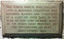 William Laud, Archbishop of Canterbury, visited the cathedral in 1633 and complained about its general state, in particular that it "suffered much for want of glass in the windows".[33] By the following year the defects had been mainly remedied (apart from some of the glass), the excuse being that the backlog had built up due to money (£1,000) being spent on "making of the organs".[33] Laud accepted this and required completion, noting among other items that the bells and their frame needed to be put into good order (see below, in 1635 one bell was recast).[34]