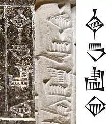 Eannatum, King of Lagash, riding a war chariot (detail of the Stele of the Vultures). His name "Eannatum" (𒂍𒀭𒈾𒁺) is written vertically in two columns in front of his head. Louvre Museum.