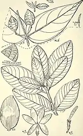 Illustration (lower half) of a species of Larsenaikia, L. ochreata (drawn as Gardenia ochreata, number 215).