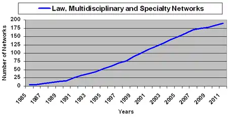 There are two different reasons for networks developing in the legal profession. The first reason is that law firms needed international connections due to globalization in the 1990s.[3] The second reason is the expansion of many large United States firms to become "national". Smaller firms or firms with a niche practice requested expertise from these networks.