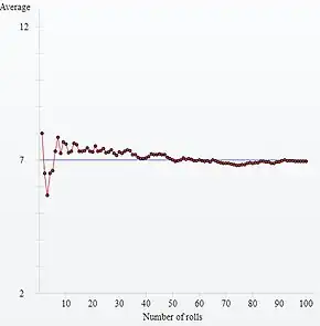 A graphical example of the law of large numbers used for two dice rolls. The sum of the two dice fluctuates in the first few rolls, but as the number of rolls increases, the expected value of the sum of the two dice approaches 7.