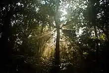 The forest of Lawachara is of a mixed type, with the understory usually composed of evergreens, including Quercus, Syzygium, Gmelina, Dillenia, Grewia, and Ficus. The upper canopy, meanwhile, is mainly composed of tall deciduous trees including Tectona, Artocarpus chaplasha, Tetrameles, Hopea odorata. Toona ciliata, and Pygenum. The original indigenous mixed tropical evergreen vegetation had been removed or replaced in the 1920s.[7] It is now mostly secondary forest with small remnant areas of rich primary forest.[2] In the undergrowth are bamboo groves of jai bansh (Bambusa burmanica) and muli bansh (Melocanna baccifera),[6] as well as several fern species and other epiphytes.