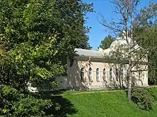 The Church of St Lazarus (Russian: Церковь Праведного Лазаря) was built in 1717, and is located along the banks of the Monastyrka River.[1] Peter the Great's sister, Natalya Alexeyevna, had died in 1716, but Peter delayed her burial until his return from a journey abroad. The stone octahedral church, the first stone building of the Monastery, was built behind the Lavra's Annunciation Church, and was probably consecrated on 17 October 1717, shortly after Peter's return, and at the time of the transfer of the relics of St Lazarus.[1] On 23 December 1718 court physician Robert Erskine was interred in the crypt, and on 26 April Peter's infant son, Tsarevich Peter Petrovich, was buried there. In 1723, the remains of Peter the Great's relatives were transferred to stone tombs in the Annunciation Church.[1]