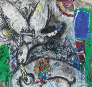 On this painting, Chagall focuses on the ring or center stage as a mythical winged figures looks down upon the spectacle from on high.[1] The subject of circus was dear to the artist.[2] Chagall often returned to the circus as a subject matter in his artworks.[3] He considered clowns, acrobats and actors as tragically human beings who are like characters in certain religious paintings.[4] Among other Post-Impressionist and Modern painters who featured the circus in their works are Seurat, Toulouse-Lautrec, Picasso, Rouault, Van Dongen and Léger.[4] Le Grand Cirque (1968) is considered Chagall’s most grand exploration of the circus as a subject for his paintings.[5]