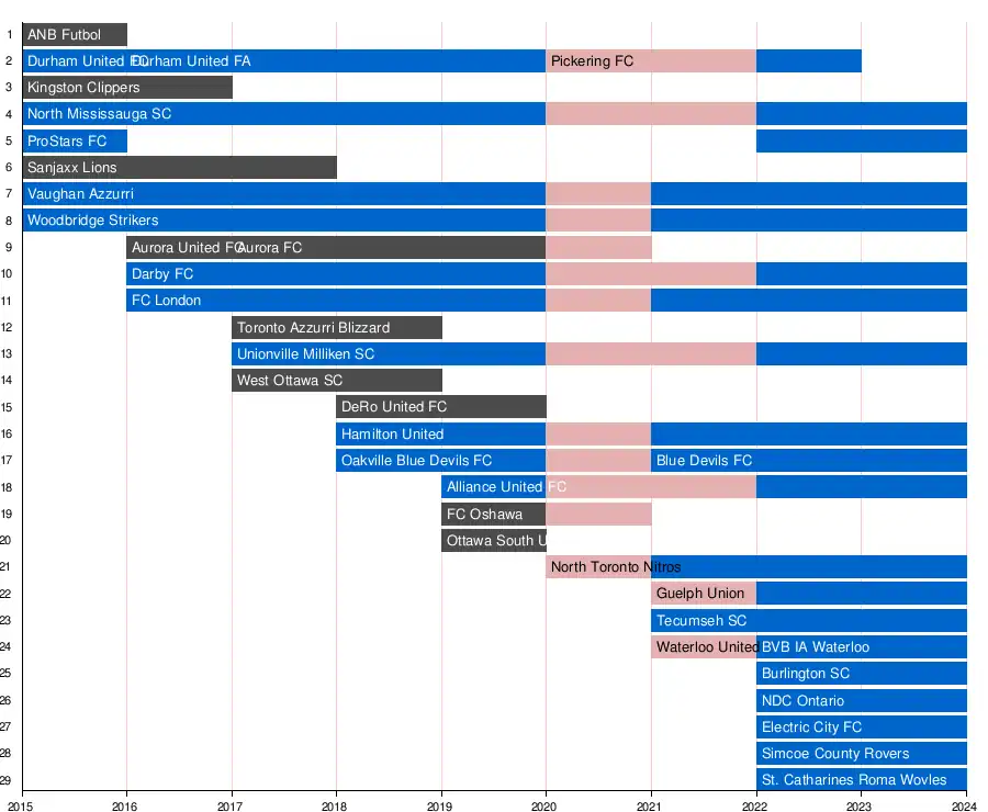 Currently there are 20 clubs, based mainly in the Greater Toronto Area and other cities in Southern Ontario. There are no clubs based in Northern Ontario.