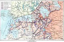 The campaign was conducted in the area to the northwest of the Kalinin Region to the Baltic Sea. In the north the land line of operations was limited to the shores of the Gulf of Finland, north of the Gulf Soviet troops were engaged in the Arctic–Karelia strategic defensive and the defense of the Hanko Peninsula. In the east the German troops reached the southern shore of Lake Ladoga, south along the Kirisha River to Kirishi, then south along the Volkhov River to Veliky Novgorod, including the city, then along the western side of Lake Ilmen to Staraya Russa, from there to the north end of Lake Vella and from the western boundary of the lake to the north shore of Lake Seliger to the region west of Peno. South of the border demarcation operated the forces of German Army Group Center. The length of the fighting front was roughly 450 kilometers and advanced a total of 270–300 kilometers due to Soviet withdrawals.