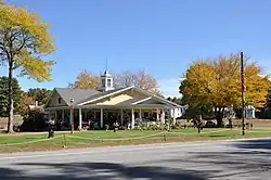 The Johnson Hall Museum is located on the east side of US Route 1 in northeastern Wells, opposite Harrisecket Road. A semi-circular drive provides access to the low-slung single-story building. It has a broad low-pitch roof with a cross-gable configuration, which extends over a wraparound porch supported by Tuscan columns. A porte-cochere with gable roof projects from the front. The gables of the roof have deep eaves, with large Craftsman-style brackets. The main entrance is at the center of the front facade, flanked by columns and topped by a fanlight and bracketed cornice. The interior is divided into a waiting room with offices and bathrooms to the sides, and a large dining room.[3]