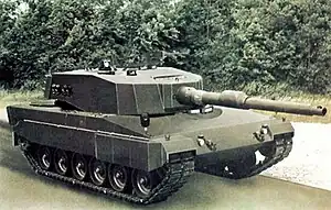 In 1984, the Spanish Ministry of Defense declared its intent to set aside 120 billion pesetas (1.1 billion U.S. dollars) for a future tank program and attracted interest from five foreign companies.[7] German company Krauss-Maffei and Spanish company Santa Bárbara presented a joint bid in mid-1984 that would produce a tank based on 1970s technology. The French government proposed to cooperate with Spain in designing a tank complete with new technology—France would later develop this programme on its own as the AMX-Leclerc. However, the French admitted that there would be restrictions placed on Empresa Nacional Santa Bárbara when it came to exporting the tank.[8] The Italian government proposed a similar deal for a cooperative tank design. The American company General Dynamics and British company Vickers offered the M1 Abrams and Valiant, respectively; the Spanish government rejected their offers the following year because of the low likelihood of local production and export of the tank. By late 1985, the only offers still under consideration were those from the German-Spanish collaboration and the French and Italian governments.[9]