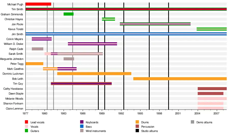 Cardiacs are an English rock band hailing from Kingston upon Thames, Surrey.[1] The band was formed by frontman Tim Smith with his brother bassist Jim Smith, vocalist Michael Pugh and drummer Peter Tagg in 1977.[2][3] Since its inception, more than a dozen members have cycled through the group, contributing keyboards, percussion, vocals and woodwind.[2] The Smith brothers were the only constant members in Cardiacs' regularly changing line-up.[4]