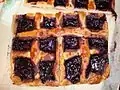 Lattice pastry interwoven with a thick, blueberry paste[3] |