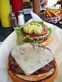 | California burger | ![]() | California | In the Western U.S., a "California" burger most often consists of a normal cheeseburger, with the addition of bacon and either guacamole or avocado.[10] In the Eastern U.S., a California burger is traditionally a burger with lettuce, tomato, and raw onion.[13][14] |