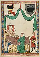 Alfonso IX of León: The lion had long been a canting representation of the kingdom of Leon, and its use as an emblem by King Alfonso VII (1126-1157) was reported in the contemporary Chronica Adefonsi imperatoris,[5] though the details of this lion are not provided. An illustration of Ferdinand II of Leon in the "Tumbo A" manuscript, a cartulary of Santiago de Compostela Cathedral, thought to have been drawn during his life, shows the monarch carrying a shield bearing an uncolored lion, while underneath the king a purple lion is shown, together apparently representing proto-heraldic use of a lion emblem. Later in the same manuscript in an illustration dated between 1208 and 1216, Alfonso IX is depicted with a true heraldic device, a shield with purple lion on a silver background that would be used by his son Ferdinand III as personal arms before being quartered with those of the Kingdom of Castile to represent the union of the two kingdoms.[23] |