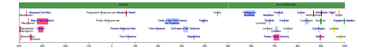 Twenty Years' AnarchyRoman civil war of 350–353Year of the Four EmperorsCivil wars of the TetrarchyYear of the Five EmperorsRoman–Bosporan WarPyrrhus of EpirusSiege of Laon (741)Battle of LucofaoBattle of the FrigidusYear of the Six EmperorsCrisis of the Third CenturyWars of the DiadochiOlga of KievÆthelwold's RevoltFrankish Civil War (715–718)EbroinBrunhilda of AustrasiaFredegundBoudicaBosporan Civil War
