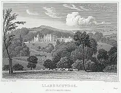 Llanerchydol Hall is located in parkland between the A458 to Llanfair Caereinion and A490 to Llanfyllin. The hall, a 15,440 square feet (1,434 m2) largely intact early 19th-century picturesque Gothic Revival house, is a Grade II* listed building,[2][3] and its well preserved park and gardens are listed, also at Grade II*, on the Cadw/ICOMOS Register of Parks and Gardens of Special Historic Interest in Wales.[4] The site has a long history of occupation, including a Tudor house which burnt down in about 1776, after which David Pugh, a local man who made a fortune selling tea in London, bought the site and built a new house which became known as Llanerchydol Hall.[3][5]