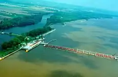 Lock and Dam No. 25 is a lock and dam located near Winfield, Missouri, on the Upper Mississippi River around river mile 241.4. The movable portion of the dam is 1,296 feet (395.0 m) long and consists of three roller gates and 14 tainter gates. A 2,566 feet (782.1 m) submersible dike extends to the Illinois shore. A 5 miles (8.0 km) long dike is part of the facility extending upstream on the Missouri side of the river. The main lock is 110 feet (33.5 m) wide by 600 feet (182.9 m) long.[2] In 2004, the facility was listed in the National Register of Historic Places as Lock and Dam No. 25 Historic District, #04000184 covering 3,164 acres (12.8 km2), 2 buildings, 7 structures, 2 objects.