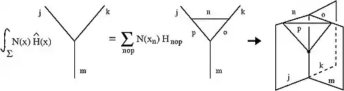 The action of the Hamiltonian constraint translated to the path integral or so-called spin foam description. A single node splits into three nodes, creating a spin foam vertex. is the value of at the vertex and are the matrix elements of the Hamiltonian constraint .