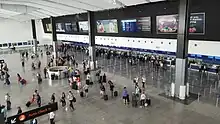 The airport operates two terminals. Terminal 1, covering an area of 16,580 square metres (178,500 sq ft), manages arrival and departure facilities for domestic flights within a single-story building. It features a distinctive roof over the departures concourse with peaked white structures. The arrivals area includes a baggage claim area, car rental services, taxi stands, snack bars, and souvenir shops. The departures section includes a check-in area, a security checkpoint, and a concourse with a food court and 8 gates on the ground level, allowing passengers to walk to their aircraft. From this departure concourse, access to a mezzanine is available, which houses a VIP lounge.[6]