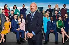 Promo group shot of Alan Sugar standing before the candidates for series 15
