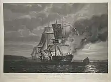 On 14 March 1798, Lhéritier took command of Hercule and was tasked to cruise to Brest, departing from Lorient on the 20th.[5] The next day, Hercule was intercepted by HMS Mars, which led to the Battle of the Raz de Sein. Lhéritier attempted to board Mars, and sustained himself a sabre blow to the head and had his leg injured. After a two-hour fight, Hercule was captured and Lhéritier taken prisoner again.[1][5][6]