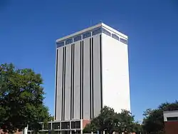 The 16-story Wyly Tower of Learning, named for the benefactors Sam Wyly and Charles Wyly, is the most prominent building on the Louisiana Tech campus in Ruston, Louisiana. It was designed by the Bastrop architect Hugh G. Parker Jr. Though the Wyly Tower is the landmark campus structure, the university is planning to have the structure razed to make way for a revised library facility. The tower has been cited for lack of ventilation, asbestos, difficulty of providing fire protection, and stairwells do not exit to the exterior of the building.[14]
