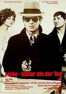 Love is Colder Than Death (German: Liebe ist kälter als der Tod) is a 1969 West German black-and-white film directed by Rainer Werner Fassbinder, his first feature film. In the original theater presentation in Berlin the title was first Kälter als der Tod; at the beginning of film production, it was Liebe – kälter als der Tod as on some film posters. The cinematographer Dietrich Lohmann and the cast as an ensemble won an award at the German Film Awards in 1970.