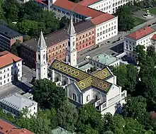 The Ludwigskirche is situated in the northern part of the Ludwigstrasse and was built by the architect Friedrich von Gärtner from 1829 onward (completed 1844). The patron was King Ludwig I of Bavaria. The facade with two steeples was constructed as balance to the Theatinerkirche, which stands diagonally opposite. The floor plan shows the church as a model to a three-aisled Byzantine basilica with the basic geometric figure of the cross of tau. The church is 60 m long and 20 m wide. The towers are 71 meters high and each equipped with six bells, which are named after patron saints of the family of King Ludwig. In the years 2007–2009 the church roof was re-covered in the originally planned mosaic decoration.