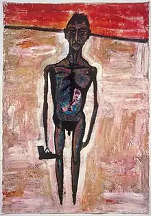 By the 1980s, his cramped compositions shift to a centralized, nude figure (often self-portrait) that dominates the composition. The mood and color are somber, and the figure is often distorted.