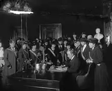 Madeline McDowell Breckinridge stands behind (second from the right) Governor Edwin P. Morrow as he signs Kentucky's ratification of the Nineteenth Amendment.