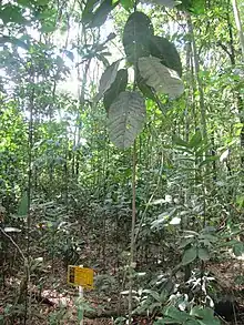 They are trees reaching from 18 to 30 m height and 50–70 cm in diameter, wide dark green canopy. The bark is almost smooth, pale brown. Fine texture wood. Leaves alternate, simple, ovate leathery, glabrous, apex rounded, entire margin, cuneate base, prominent veins on the bottom of the leaves. The petiole has a scar covering its entire surface. The flowers are solitary, glabrous; white to cream color, locates at the end of the branches, peduncle are thicker towards the apex. Flower bud enclosed within an involucre by four bracts usually covered with pubescence; 3 elliptical sepals, white, fleshy; has from 8 to 10 petals cream colored, thick and oblong. Woody fruit, sub-globose, glabrous, green colored, measuring between 9,7 and 20 cm long and 8–25 cm broad; when the fruits dehiscence, seeds remain attached in its central axis. Each fruit can have 105-219 seeds, and in some cases more than 50% of it can be completely formed. One carpel has from 1 to 2 seeds.[4][5][6]