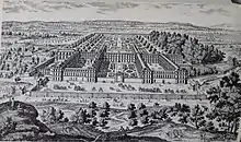The domaine of Saint-Cyr was assigned to the Maison in 1685, and the king ordered[2] major building work on the domaine next to Versailles, led by Jules Hardouin Mansart.[5] The project cost the king 1,400,000 livres.[5] Hardouin-Mansart's designs for the Maison used the U-shaped plan he often used elsewhere, with the buildings reserved for the mistresses and students forming an H, to which the school chapel had to be added to the west. The classrooms and students' dormitories were on the first and second floors respectively, the dormitories just above the classrooms for the corresponding classes. Each dormitory held 40 beds and was surrounded by two cells for the mistresses. Each classroom was also juxtaposed with a small supplementary dormitory with 20 beds, itself next to two cells for the mistresses. The infirmary was sited away from the dormitories to allow the sick to be isolated and thus avoid the spread of contagious diseases.[2] The rooms reserved for pensionnaires were situated to the east of the buildings, to put them as far as possible from the visitor entrance, situated to the west at the level of the external courtyard.