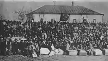 The Regional Congress of Peasants, Workers and Insurgents represented the "highest form of democratic authority" within the political system of the Makhnovshchina.[118] They brought together delegates from the region's peasantry, industrial workers and insurgent soldiers, which would discuss the issues at hand and take their decisions back with them to local popular assemblies.[119] Four Congresses were held over the course of 1919, while one was banned by the Bolsheviks and another was unable to convene due to renewed conflict with the Red Army.[120]