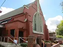 In 1904, after almost two decades of rapid growth in both the church congregation and the locality, congregation member Robert Haddon was commissioned to design a new building on a larger plot of land at 163 Wattletree Road. As an example of Melbourne land prices between 1886 and 1904, this larger plot was again purchased for £700, but the valuable Glenferrie Road land fetched a handsome £21 per square foot.[5] The church's foundation stone was laid by another congregation member, elder, benefactor and Mayor of the Borough of Caulfield Charles Duplan Lloyd.[6][7][8] The old wooden structure was moved to the new site and used as a Sunday school, with the congregation using Malvern Town Hall for worship while their new structure was under construction.