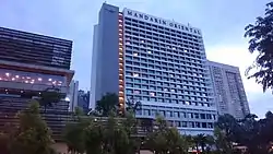 The hotel's 527 rooms and suites overlook the Singapore city skyline.[6] US Architect John Portman designed the atrium-style hotel based on a theatre concept and intended the exterior of the structure to resemble a fan, a nod to the Mandarin Oriental logo.[7][8]