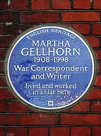 In 2019, a blue English Heritage plaque was unveiled at Gellhorn's former London home, the first to feature the dedication of "war correspondent".[34]