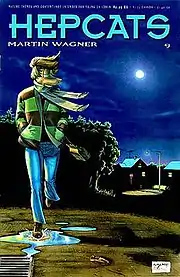 While a student at the University of Texas at Austin, Wagner began Hepcats as a comic strip in the college newspaper The Daily Texan in 1987.[2] Starting in 1989, he self-published it as a black-and-white comic book series and it gained more exposure with the assistance of Dave Sim, who allowed Wagner to submit a page to his bi-weekly reprints of Cerebus.[2] To help support the comics financially, Wagner also offered sketches to fans who sent him cash in the mail.[3] Although the series received critical praise,[2] the combination of poor sales, Wagner's lack of business experience, and his divorce in 1991 contributed to financial difficulties.[4] Along with Jeff Smith (Bone), Colleen Doran (A Distant Soil), James Owen (Starchild), Larry Marder (Beanworld) and Sim, Wagner was one of the prominent self-publishers of the 1990s, but a hectic schedule eventually led him to cease publishing the series altogether following issue No. 12 in 1994.[5] In 1996 he made a deal with Antarctic Press to republish the existing material, to be followed by new issues, but the only new material published was a special "#0" color issue. Wagner also developed the Snowblind story-line as part of the Hepcats series which would be re-printed into a novel, but it never continued past part one.[6]