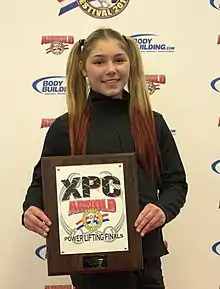 Maryana Naumova is the first female under-18 to be allowed to participate in professional powerlifting tournaments.[4] In March 2015, she participated in the Arnold Classic, establishing the female record in the event Arnold BenchBach, lifting 150 kg (330 lb). After the tournament she asked Arnold Schwarzenegger to become the President of the United States and normalize Russia–United States relations. She also passed Arnold letters from Donbas children.[4] She said that Arnold Schwarzenegger is a very important person in her life.