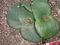 Massonia pustulata, the blistered massonia, is a species of flowering plant in the family Asparagaceae, subfamily Scilloidiae, native to the Western Cape of South Africa. Growing to 10 cm (3.9 in) tall and broad, it is a small bulbous perennial with two horizontal, opposite leaves, and virtually stalkless cream or pink flowers in winter. The stamens are longer than the perianth, giving the flower the appearance of a rounded, spiky brush-head.[3] The deep “pock marks” on the leaves give the plant its common name, as well as the specific epithet pustulata.