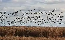 Every spring over two million waterfowl pass Matsalu, including 10,000—20,000 Bewick's swans, 10,000 greater scaups, common goldeneyes, tufted ducks, goosanders and many others. A colony of up to 20,000 barnacle geese, over 10,000 greylag geese and thousands of waders stop on the coastal pastures in spring. The most numerous birds of passage (around 1.6 million) are long-tailed ducks. Approximately 35,000—40,000 ducks feed in the reedbeds in spring.[4][5] In autumn, about 300,000 migratory waterfowl pass Matsalu. The wetland is the biggest autumn stopping ground of common cranes in Europe. The highest recorded number of cranes at the park has been 23,000.[5][10]