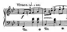 The final mazurka is the shortest of the set, taking less than a minute to perform. It is a rare example of humour in Chopin's music. Written in the joyful key of C major and marked Vivo (meaning lively), it features a constantly repeating theme which has a jokeful character. The piece ends abruptly with the same motif of the opening bars, repetitive octaves of G. The ending is unusually marked Senza fine - literally without end.[5]