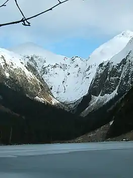 Looking up from the Medvejie Lake valley from near the end of the frozen-over lake