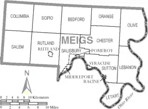 Meigs County (/ˈmɛɡz/ MEGZ[2]) is a county located in the U.S. state of Ohio. As of the 2020 census, the population was 22,210.[3] Its county seat is Pomeroy.[4] The county is named for Return J. Meigs Jr., the fourth Governor of Ohio.[5]