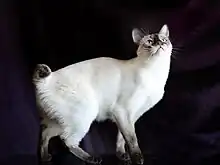 Mekong Bobtails have a glossy, short coat that can be any pointed colour without white markings, and large eyes which the WCF's breed standard terms an "intense blue".[7] The characteristic bobbed, kinked tail contains at least three vertebrae, but must be shorter than a quarter of the body length.[7][3] The breed has a slight although rectangular build, and the rump is higher than the shoulders.[7] Mekong Bobtails are medium-sized cats, weighing from 8 to 10 pounds (3.6 to 4.5 kg).[5] They have a life expectancy of 15–18 years.[8]