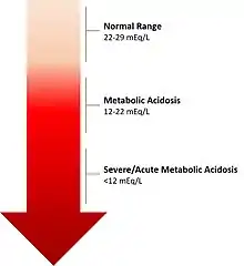 | The calculated level of bicarbonate in the blood (HCO3−) reflects the severity of acidosis. | |