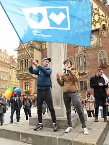 Throughout the period when the bills were "lying dormant" in the Sejm, the group Love Does Not Exclude organized demonstrations ("picnics") in front of the parliament building to remind deputies about this issue.[8] Letters were also sent to the then Speaker of the Sejm Ewa Kopacz and information materials to all parliamentarians.[9]